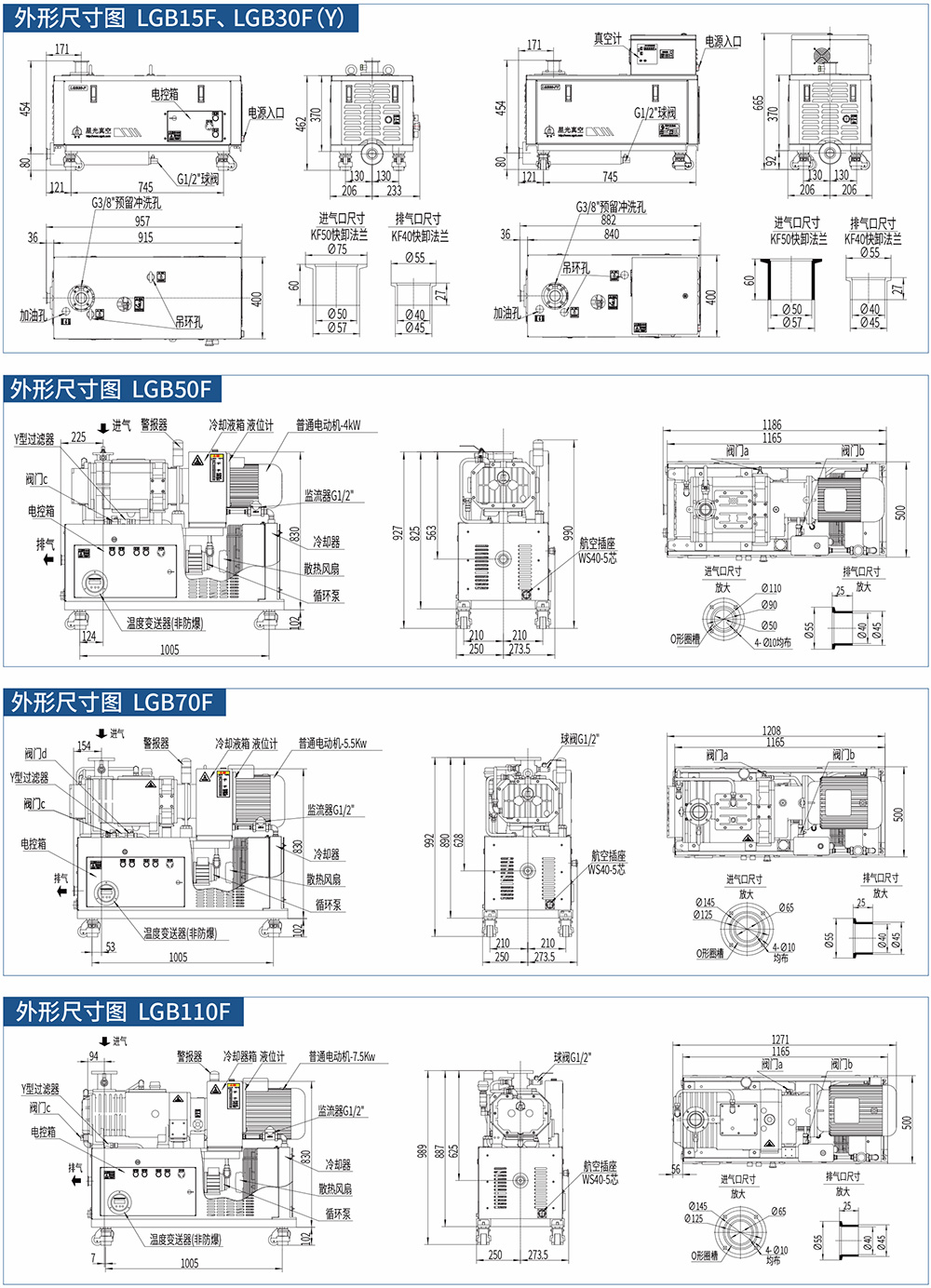 F系列風冷干式螺桿真空泵不依賴外部循環(huán)水,通過自身獨特的風冷降溫(LGB30F/LGB30FY)或冷凍液循環(huán)降溫(LGB70F/LGB110F)系統(tǒng)來完成熱量交換,保證了真空泵的可靠、長期運行,是一次技術上的極大革新。